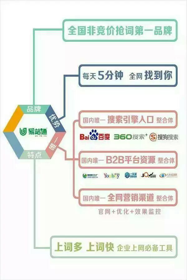 1個易站通金牌商盟=企業(yè)網(wǎng)站(pc網(wǎng)站+手機(jī)網(wǎng)站+微網(wǎng)站)+全網(wǎng)搜索引擎免費(fèi)推廣(百度PC+百度移動+360推廣+搜狗推廣)+400家B2B全網(wǎng)推廣(10家知名B2B金牌會員+17家知名 B2Bvip會員+350家聯(lián)盟B2B免費(fèi)會員)+效果監(jiān)控+微信群自助管理。