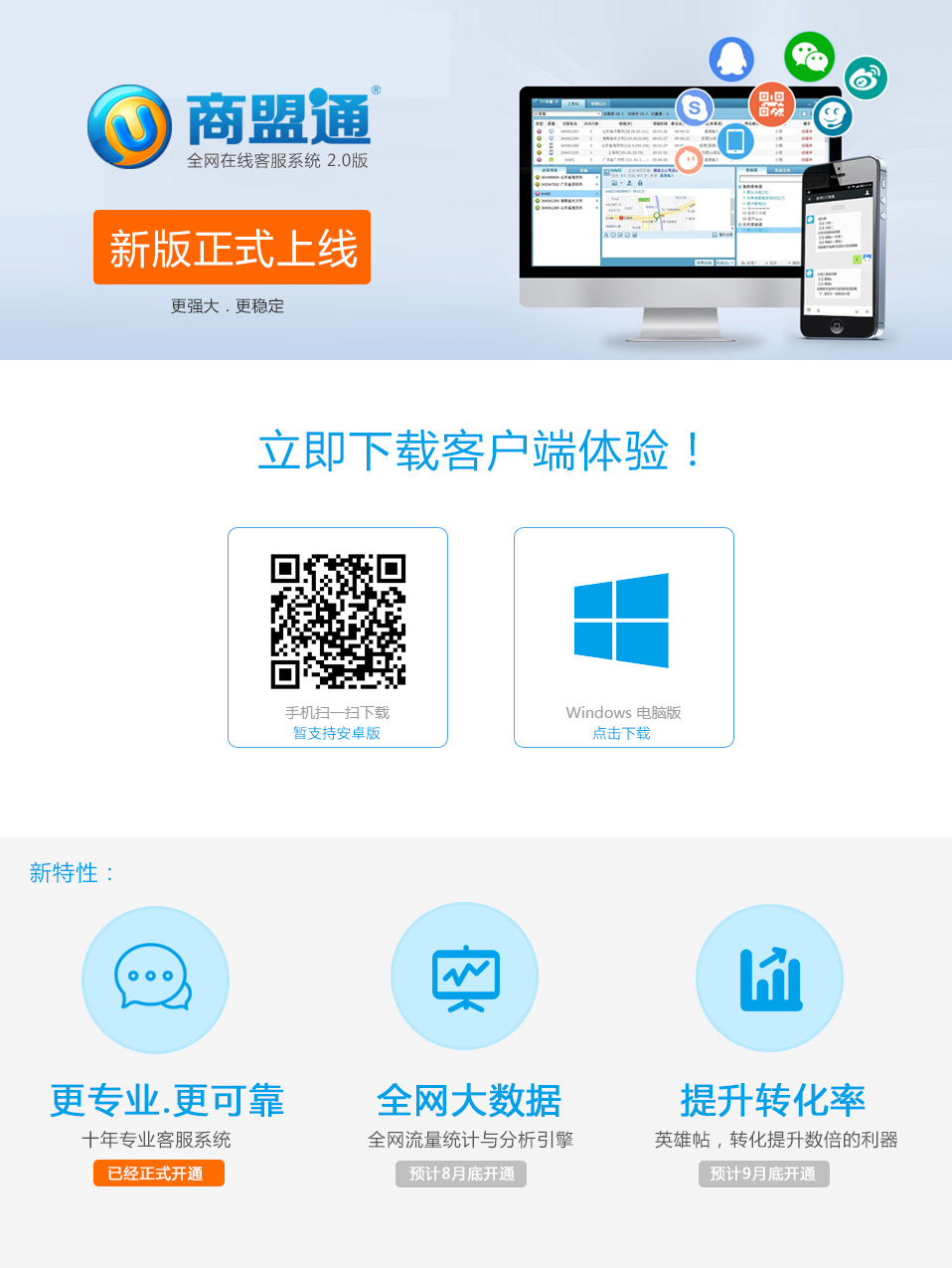 1、新版商盟通在線客服支持PC和手機客戶端(安卓版),客戶端下載地址為: