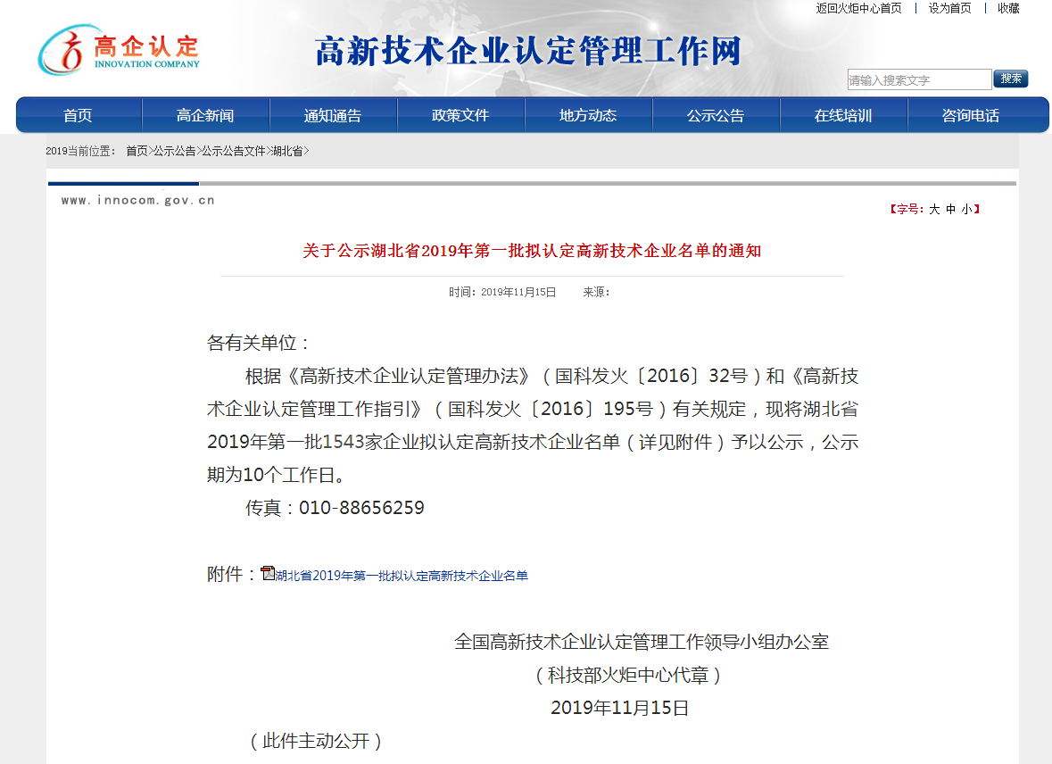 根據(jù)《高新技術(shù)企業(yè)認定管理辦法》(國科發(fā)火〔2016〕32號)和《高新技術(shù)企業(yè)認定管理工作指引》(國科發(fā)火〔2016〕195號)有關(guān)規(guī)定,現(xiàn)將湖北省2019年第一批1543家企業(yè)擬認定高新技術(shù)企業(yè)名單(詳見附件)予以公示,公示期為10個工作日。