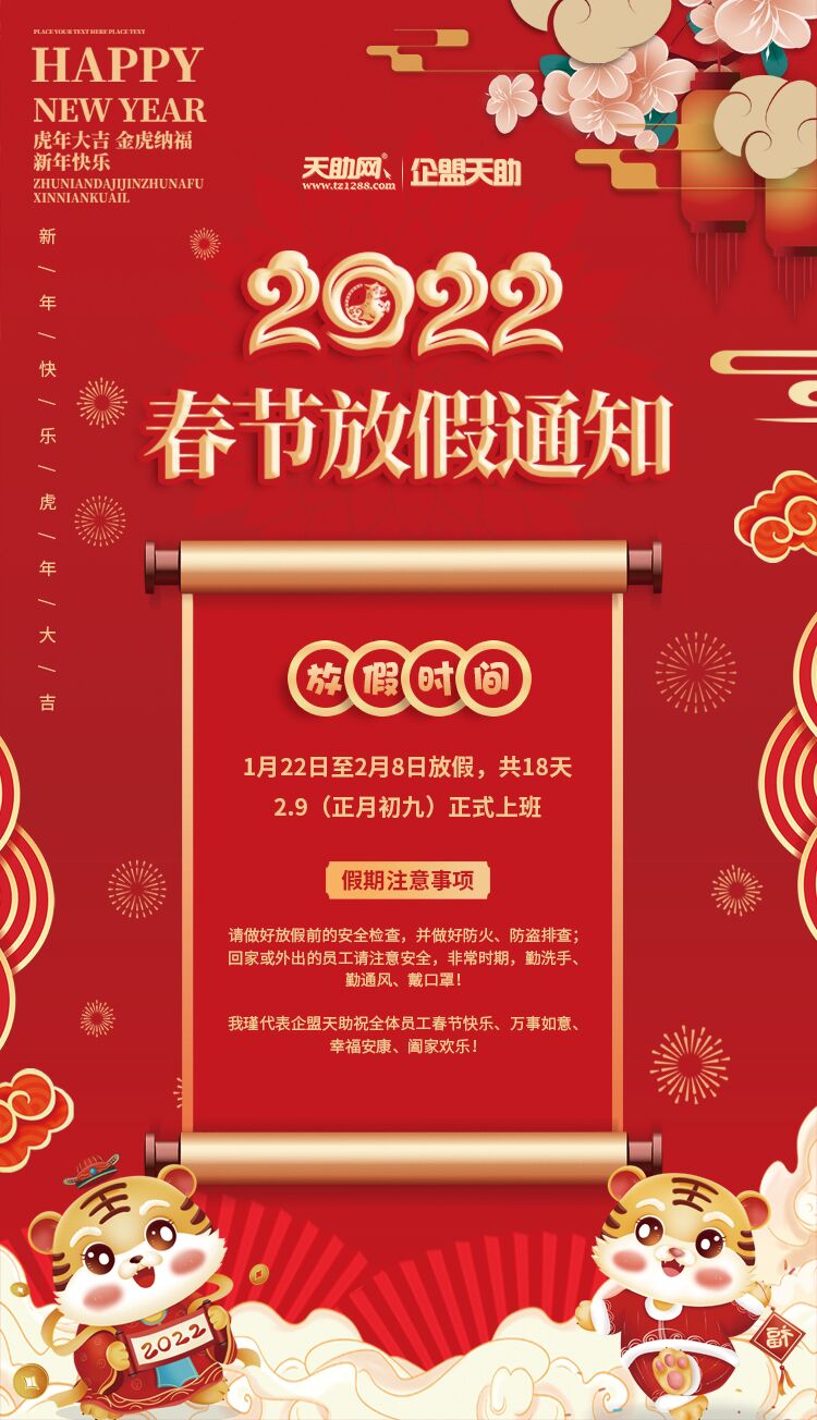 春節(jié)放假時(shí)間:2022年1月22日至2022年2月8日,共18天。2月9日(正月初九)正式上班。