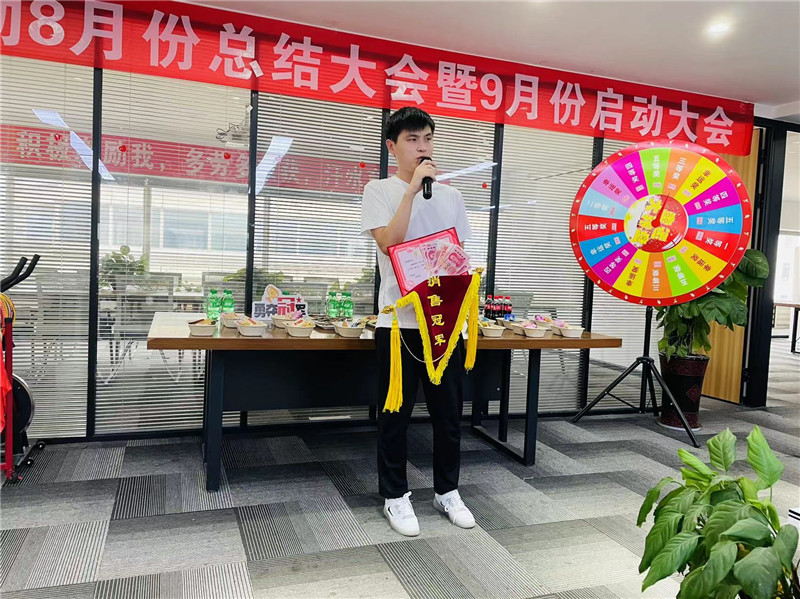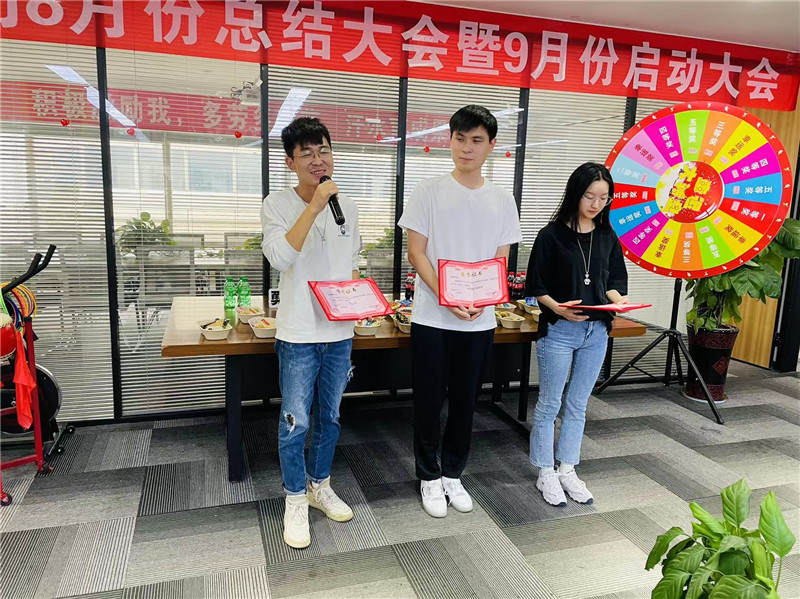 最后,我們頒發(fā)月度前三:張鋮 ;服務(wù)之星:馮鈺;技術(shù)之星:張錦程,新客戶最多:張鋮。肖總為獲獎?wù)哳C發(fā)獎后,獲獎?wù)咭灰话l(fā)表獲獎感言。