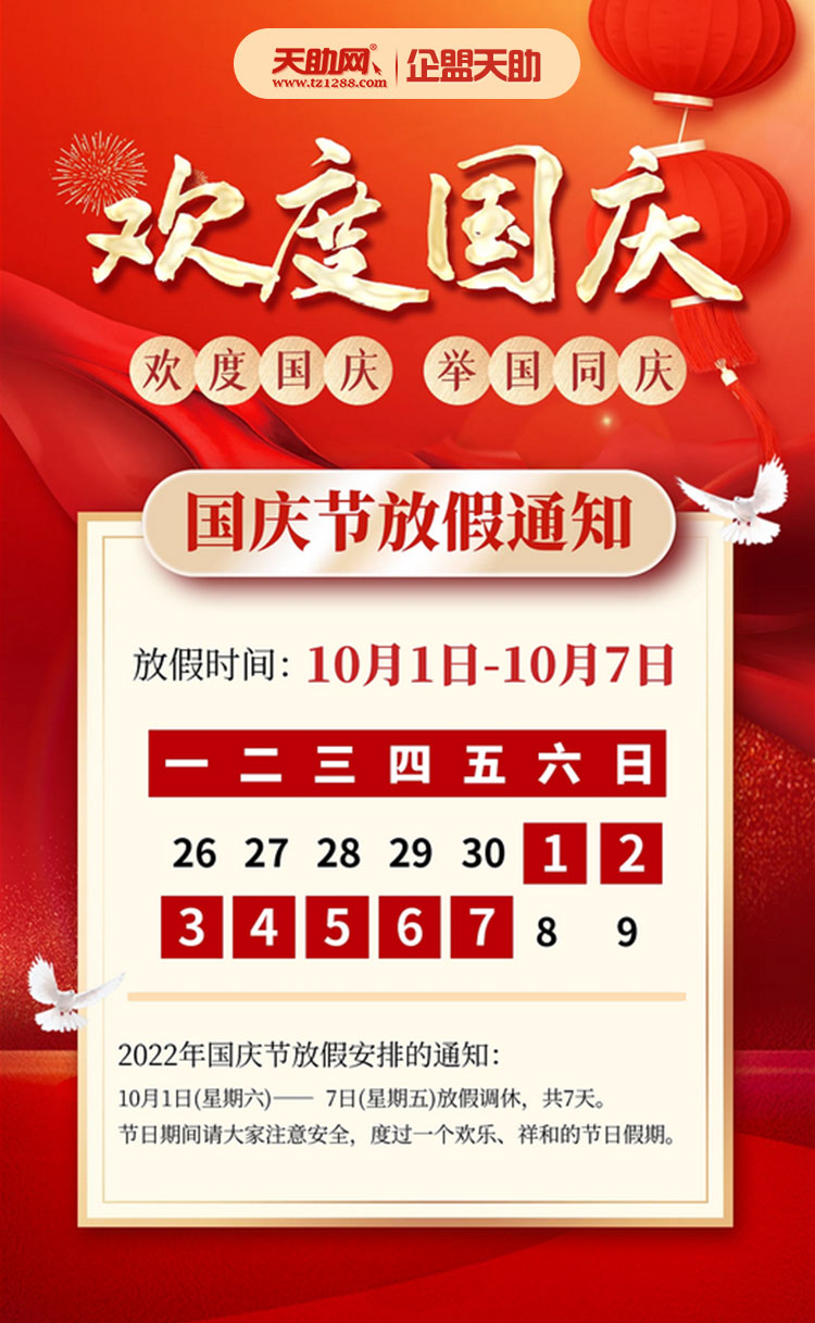 國(guó)慶節(jié)來(lái)臨之際,我謹(jǐn)代表企盟天助祝廣大客戶(hù)及企盟天助全體員工節(jié)日快樂(lè),萬(wàn)事如意!