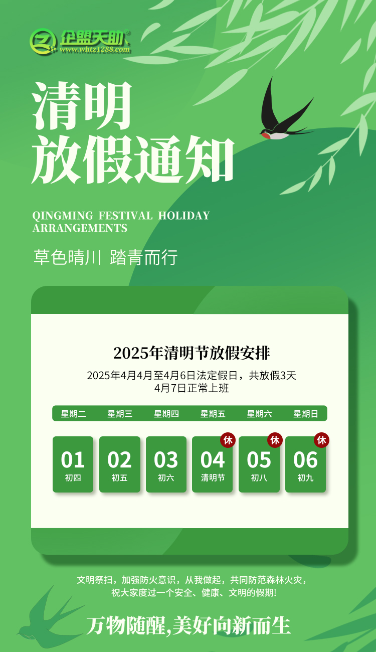 根據(jù)《國(guó)務(wù)院辦公廳關(guān)于2025年部分節(jié)假日安排的通知》,現(xiàn)將2025年清明節(jié)放假安排公布如下: