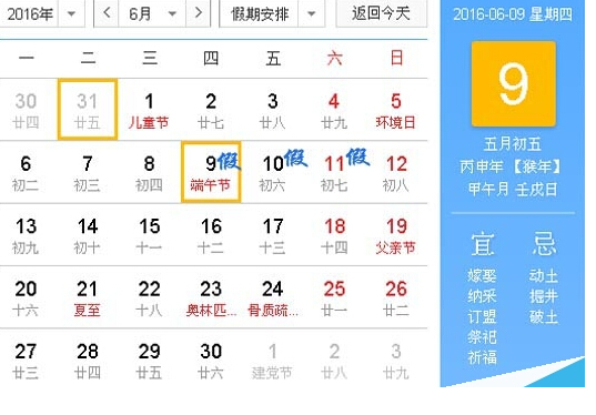 端午節(jié): 2016年6月9日至6月11日,共3天。6月12日(周日)上班。